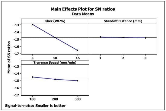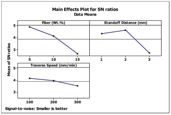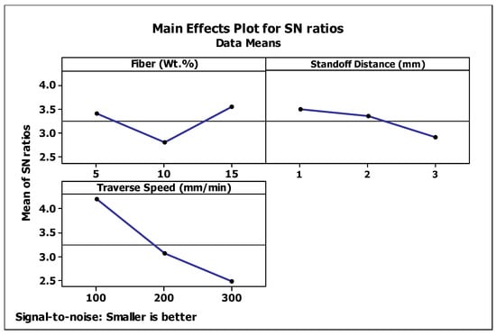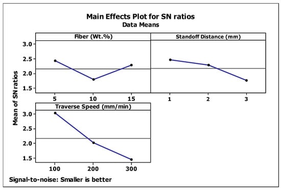 Table 7 shows the SR values of the machined surfaces. Figure 5 shows the main effect plot of the S/N ratio for the surface roughness of the test sample. In the main effect plot, it can be seen that a fiber Wt. of 5%, an SOD of 1 mm and a TS of 100 mm/min are the optimum conditions for obtaining a better surface finish during AWJ machining.