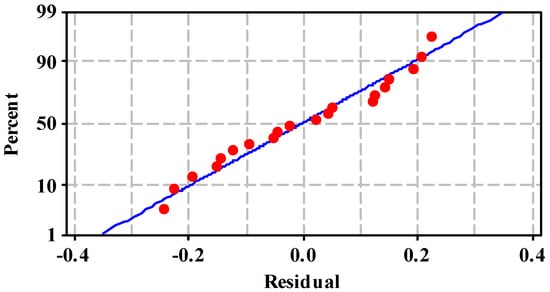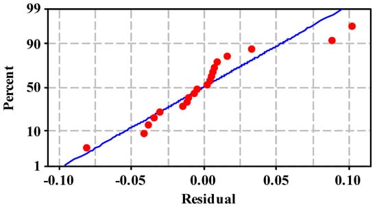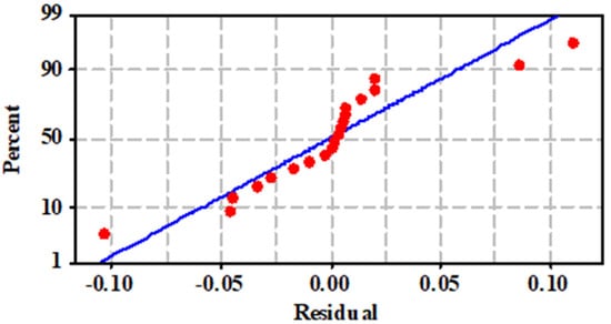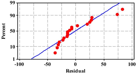 The second-order response surface used to estimate the bottom kerf width during the AWJM of the test samples is developed by considering the fiber (Wt.%), standoff distance and traverse speed. Equation (9) shows the relationship between the process parameters and the bottom kerf width, where, A = Fiber (Wt.%), B = SOD (mm), and C = TS (mm/min). The ANOVA for the developed response function of the material removal rate is detailed in Table 15. The R2, R2 (pred) and R2(adj) values for the ANOVA are 89.25%, 59.84% and 77.31%, respectively. As seen in the ANOVA table, Fcal (α = 0.05, 8.27) is greater than Ftab (α = 0.05, 9,9 = 3.18), and this is indicates that the response function is statistically significant. Figure 19 shows the normal probability plot of residuals for the BKW. The RSM-predicted values for the experimental trials comply with the actual experimental trials, with an average error percentage of 5.68%.