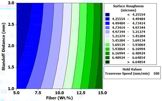 The second-order response surface used to estimate the SR is formulated using the fiber (Wt.%), standoff distance and traverse speed parameters. The relationship between the SR and the process parameters is given in Equation (6), where A = fiber (Wt.%), B = SOD (mm), and C = TS (mm/min). The ANOVA for the response function of the SR is shown in Table 9. For the developed response model, R-Sq = 96.83%; R-Sq (pred) = 49.61%; and R-Sq (adj) = 93.30%. As seen in the table, Fcal (α = 0.05, 30.41) is greater than Ftab (α = 0.05, 9,9 = 3.18), and this indicates that the developed response function is statistically significant. Figure 7 shows the normal probability plot of residuals for the surface roughness. The RSM-predicted values for the 27 experimental trials are accurate, with an average error percentage of 3.49% compared to the experimental results. Figure 8 and Figure 9 show the contour and surface plots of the SR, respectively. In the figure, the intermediate values of the SR between the different ranges of the process parameters can be identified. It is evident from the figure that the increase in fiber (Wt.%) increased the SR of the test sample.