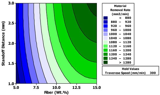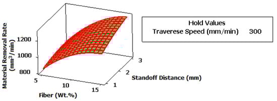 Figure 11 shows the normal probability plot of residuals for the MRR. The RSM-predicted values of the output parameters comply with the experimental trial values, with an average error percentage of 14.21% compared to the experimental results. Figure 12 and Figure 13 show the contour and surface plots of the MRR. The contour plot is prepared by considering different levels of fiber wt.% and standoff distance, whereas the traverse speed is held constant (300 mm/min). In the figure, the intermediate output values of the MRR at different ranges of the process parameters can be identified. It is evident from the figure that the increase in the SOD and TS increased the MRR of the test sample.