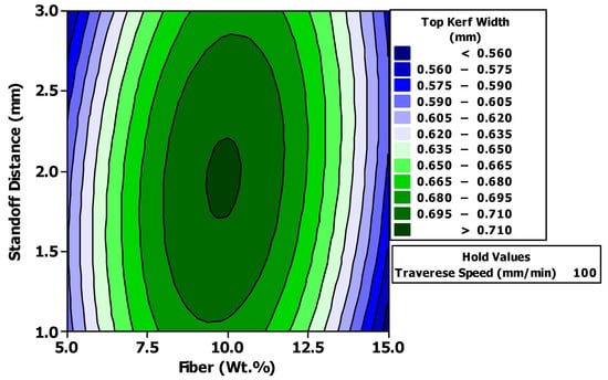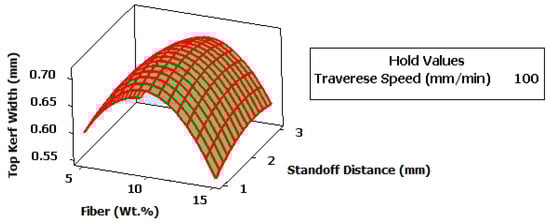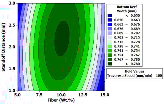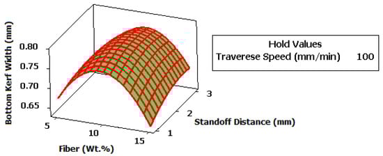 Figure 20 and Figure 21 show the contour and surface plots of the bottom kerf width, respectively. The contour plot is prepared by considering different levels of fiber wt.% and standoff distance, whereas the TS is held constant (100 mm/min). As seen in the Figure, the lower bottom kerf width can be achieved at a fiber wt.% of 5 and 15. However, at 10 wt.% of fiber content, the bottom kerf width is observed to be slightly higher. The 3D surface plot shows that the increase in the SOD increases the bottom kerf width. Table 16 shows a comparison between the experimental and RSM-predicted response parameters for the 27 experimental trials.