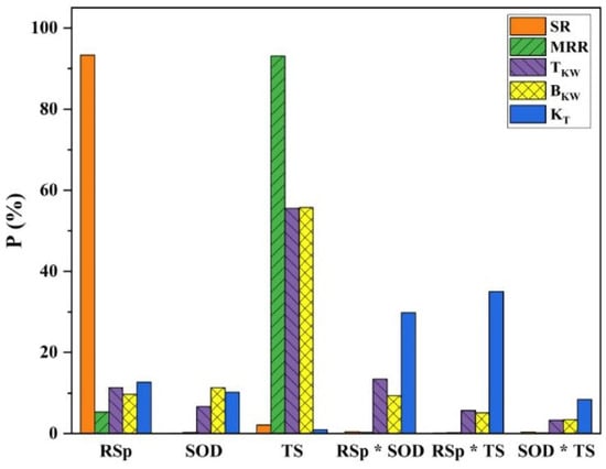 Figure 23 shows the overall contribution of each process parameter to the SR, MRR, TKW, BKW and KT. The fiber Wt.% showed the maximum percentage contribution to the SR (93.35%). However, the TS showed the maximum percentage contributions of 93.13%, 55.50% and 55.70% to the MRR, TKW and BKW, respectively. The interaction between the fiber and TS showed a higher contribution (35.04%) to the KT. Overall, the contribution of the SOD to the machining quality was lower than that of the other process parameters.