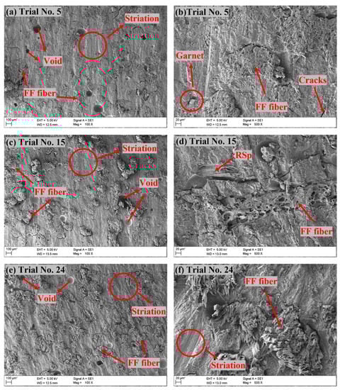 Figure 24 shows the SEM images of the AWJ-machined surfaces of the test samples at different magnification levels. Figure 24 shows the presence of voids in the machined surfaces, which appear like globular pits. Figure 24a–c show the RSp and FF fibers attached to the machined surfaces. These irregularly arranged fibers on the machined surface appear to be one of the reasons for the higher surface roughness of the machined test samples. Due to the softer nature of the fibers, the abrasive particles are ineffective in cutting the fibers completely as a result, a section of fibers appears on the machined surfaces. In addition, abrasive particles generate striations on the machined surfaces due to the ploughing action of the abrasive particles. This combined effect further increases the SR of the machined surfaces. The high-velocity impact of the abrasives generates minor cracks on the impacted surfaces []. Moreover, the slight debonding of the fibers is observed in the cross-sectional regions of the machined surfaces; however, no fiber pullout or delamination is noticed. The RSp and FF fibers show good bonding with epoxy under AWJM. Figure 24d shows the garnet abrasive stuck on the machined surface of the test samples.