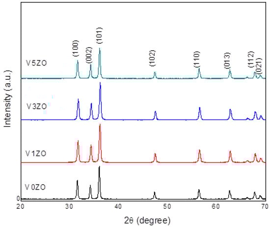 X-ray diffractometers are designed for obtaining the highest quality diffraction data, combined with ease of use and flexibility to quickly switch to different applications. The XRD spectra of undoped ZnO and V-ZnO NPs are observed in Figure 1. This technique is non-destructive and is utilized to calculate the crystallite size and determine the structure of the materials. All diffraction peaks, located at 2θ = 31.68, 34.40, 36.23, 47.55, 56.56, 62.90, 67.92, and 69.09°, corresponding to Miller indices (100), (002), (101), (102), (110), (013), (112), and (021), respectively, emphasized that the prepared samples are well crystallized in the structure called hexagonal Wurtzite, as indicated in the JPCDS card N° 36-1451 [33]. The non-existence of secondary phases was evidence for the high purity of the synthesized nanomaterials and the efficacy of the sol-gel technique. Most ZnO nanoparticles are preferentially oriented in the (101) direction. This result was also noticed with In-doped ZnO [16], Ca-doped ZnO [34], and Al-doped ZnO [12]. The average crystallite size of all samples was determined by Sherrer’s formula [35]. As illustrated in Table 1, the particle size decreased with 1 at.% vanadium dopant addition from 31 to 26 nm and increased for a 3 at.% doped sample compared to a 1 at.% doped one. Adding dopant concentration until 5 at.% raised the particle size, but it was still less than the undoped one. The reduction in crystallite size was probably due to an increase in nucluation centers during the nanomaterial synthesis [36]. In contrast, the enhancement of the size may be due to the creation of agglomerates with the increase in dopant load, which leads to larger particles [37].
