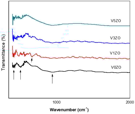 The Fourier transform infrared spectroscopy (FTIR) recorded the vibrational bonds of undoped and V-ZnO nanopowders. The obtained FTIR patterns are reported in Figure 2. A stretching band at 419 cm−1 was attributed to ZnO material. Another band observed at 940 cm−1 was due to C-H vibrations. The weak band at 620 cm−1 observed only for doped samples is assigned to vanadium oxide [38].