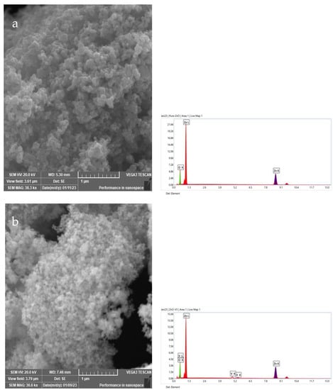 Figure 3 shows SEM photographs of undoped and V-ZnO samples calcinated at 500 °C for two hours. Pure ZnO exhibited traditional grains with a spherical and regular shape. The grain size was estimated to be less than 1 µm. Incorporating vanadium dopant in the ZnO network caused agglomerates to appear, and the grains became larger with homogeneous size, as seen in the images. EDX spectra indicated the presence of the main elements Zn, O, and V without any other impurities, indicating the purity of the obtained materials. The element percentages are reported in Table 2. Zinc exhibited a percentage of 45.59 at.%, oxygen had a percentage of 52.2 at.%, and the percentage of vanadium was 2.21 at.%.