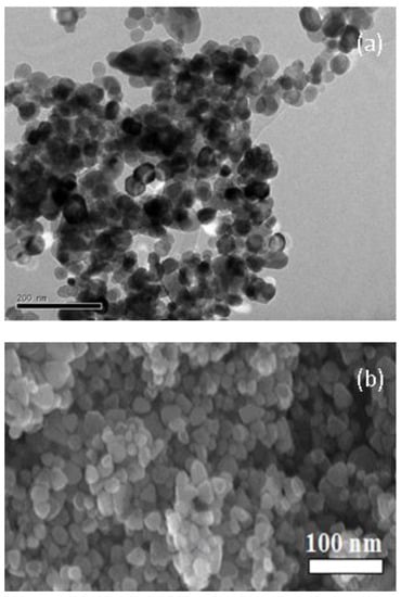 The shape and size of the synthesized nanopowders were shown by transmission electron microscopy (TEM) carried out with an electron microscope of type JEOL JEM 2010 (LaB6 electron gun, JEOL, Tokyo, Japan) that operates at 200 kV and is equipped with a Gatan 794 Multi-Scan CCD camera to do digital imaging. The surface of samples is observed using SEM observations performed using an instrument of the type Zeiss Cross Beam 540. The absorption coefficients from Fourier transform infrared (FTIR) were carried out with a spectrophotometer of type Brucker and ranged from 400 to 4000 cm−1.