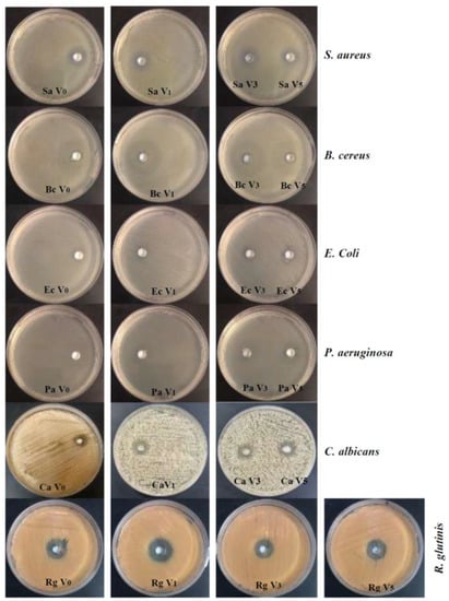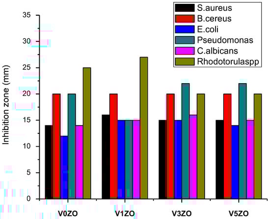 The antimicrobial activities of pure and vanadium-doped ZnO nanoparticles against two Gram+ bacteria (S. aureus and B. cereus), two Gram− bacteria (E. coli and P. aeruginosa), and two fungi (C. albicans and R. glutinis) were investigated via the inhibition zone (IZ), as shown in Figure 5.