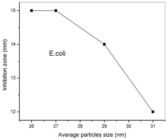 The antibacterial and antifungal activities of pure ZnO and V-doped NPs are given in Table 3. It is clear from the table that ZnO NPs doped with 1 at.% and 3 at.% V exhibited higher antibacterial activities against S. aureus, E. coli, and P. aeruginosa and higher antifungal activity for C. albicans compared to 5 at.% loading and pure ZnO. This result could be affected by the electronic defects created in the ZnO network after the incorporation of vanadium impurities. In addition, the particle size exhibited a crucial role in bactericidal and/or bacteriostatic mechanisms. In fact, as a result of reducing crystallite size, an increase in specific surface area occurs, followed by an enhancement of particle surface reactivity. All these phenomena led to an increase in the inhibition zone. As an example, the variation of E. coli bacteria’s inhibition zone with particle size is presented in Figure 6. For 26 nm, the inhibition zone IZ of Escherichia coli bacteria was 15 mm, and when the crystallite size is increased, the IZ is reduced to 12 mm. The obtained results are in concordance with the works done by Zhang and his colleagues, Yamamoto’s team, and Sawai et al. [41,42,43].