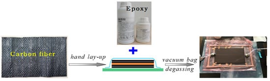 T700 carbon plain fabric (areal weight: 300 g/m2, and thickness: 0.125 mm) is supplied from Japan Toray Industries, Inc. The epoxy resin used is E51 (Nanya epoxy Co., Ltd., Kunshan, China) with a low viscosity of 600–800 MPa·s at room temperature, and Polyamide 650 is used as the curing agent with a ratio of 30:10 parts in weight. The technical data of the Resin are listed in Table 1.
