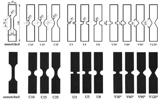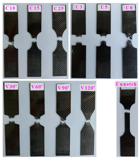 CFRP laminates have been widely applied in the aerospace, aviation and automobile industries due to their high specific stiffness, high specific strength and high design freedom. These composite laminate structures usually include discontinuities such as cut-outs for access and fastener holes for joining and inevitably become vulnerable regions under thermo-mechanical loading [,,]. Understanding their notched behaviors is necessary for designing these complex structures, in which various parts are mostly connected with bolts and rivets []. The effect of these discontinuities on the mechanical performances is an important issue because it causes a relatively large reduction in strength compared to the unnotched laminates. Koricho et al. [] proposed an innovative solution of using the ‘tailored placement’ of fibers around the holes/notch to make fabric laminates without the need for the drilling and machining of holes, thereby eliminating the sources of delamination. After drilling a hole, the tensile strength sharply decreased from 1012 MPa to 385 MPa, while the strength by adopting the developed processing could maintain 86% of the intact specimens.