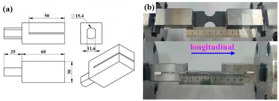 Tension tests are performed according to ASTM D638 for testing tensile properties of plastics, using a hydraulic-driven Instron testing machine 3365 series (Boston, MA, USA) and data acquisition card AD12 (Contec Corporation Ltd., Osaka, Japan). Tension tests are carried out by using a hydraulic-driven Instron tension tester at a constant crosshead displacement speed of 0.5 mm/min at room temperature, according to ASTM D3039 used for testing the tensile properties of polymer matrix composite materials. An extensometer with a gauge length of 50 mm is attached to the specimen to measure the average longitudinal strain. Three specimens of each composition are tested, and the average value is reported.