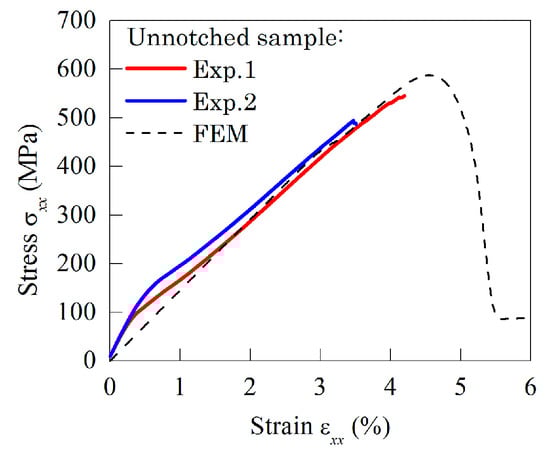Figure 4 shows the stress–strain curves of unnotched samples, where the used material properties in the present simulations are quoted from the other work [], which are given as: E1 = 140 GPa, E2 = 10 GPa, v12 = 0.3, G12 = G13 = 4.0 GPa, G23 = 4.32 GPa, S1T = 2180 MPa, S2T = 87.1 MPa and S12 = 165 MPa. The stiffness degradation method allows us to obtain the stress softening stage after the failure point in Figure 4. Moreover, these above material properties are verified by comparing the present numerical simulations with the measured stress–strain relations.