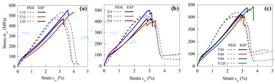 The mechanical characterization of the test samples in terms of tensile properties is conducted for different shapes and sizes of notches. The stress–strain relations are displayed in Figure 5, and it is noted that all samples show the brittle behaviors, exhibiting variations in both modulus and strength among these notched samples. Both numerical simulations and testing results present that all the circular notched samples exhibit similar stress–strain relations, and the C25 sample possesses the highest tensile strength, which is nearly similar to that of the unnotched samples. An increasing trend is found for tensile strength, suggesting that composite laminate is unaffected while increasing the notch diameter in such type of notched samples. The present predictions are in agreement with the measured results for the C-notched and U-notched samples, while the numerical calculations overestimate the tensile stiffness for the V-notched laminates and present lower predictions to their failure strengths. Furthermore, the stress–strain relations in the beginning stage of stretching are nonlinear, accompanying the marked transition from high stiffness to low stiffness. Such a change may originate from the inaccuracy in the ply orientation, off-centering clamp and sample cutting. The prediction errors in the ultimate strength between the numerical and measured results are in the range of 1~5% for the C-notch and range from 2% to 29.4% for the U-notch, while there is almost 14% underestimation for the V-notch.
