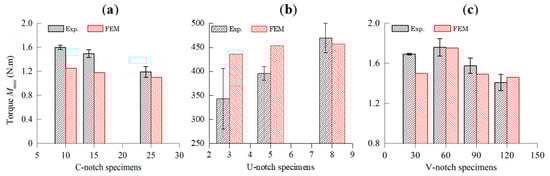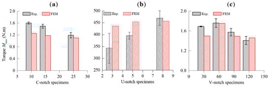 The measured and predicted failure torques of the C-notched samples in (a), U-notched samples in (b) and V-notched samples in (c).