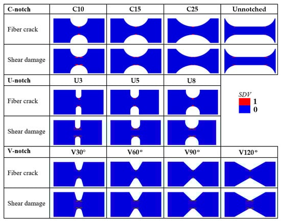 Figure 7 shows the predicted damage modes in the C-notched, U-notched and V-notched specimens with varied sizes and angles. Here, fiber crack and shear damage are the two main failure modes in the laminate structures under tensile loading. It is observed that both the fiber crack and shear damage areas gradually become more and more wide along the C-shape notch while increasing the notch radius from 10 mm to 25 mm, and the severity of damage is relatively reduced; therefore, their corresponding tensile strengths increase with the decrease in these damage modes.