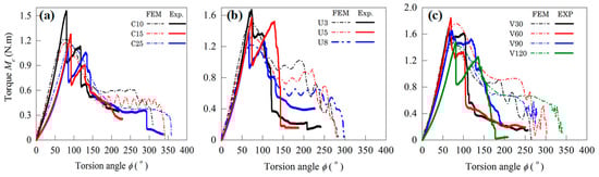 Torque–rotation angle (Me-ϕ) relations of the C-notched samples in (a), U-notched samples in (b) and V-notched samples in (c).