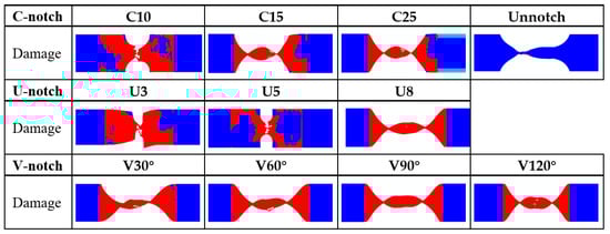 Damage mode by FEM simulations; red designates SDV = 1, and blue designates SDV = 0 in these contours.