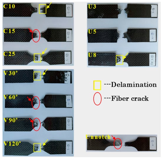 The fractured specimens after tensile failure are demonstrated in Figure 8, and these failed samples display a brittle failure mode, which is attributed to the brittle nature of carbon fiber and epoxy resin. Long splitting, multi-mode fiber pull-out and delamination are observed. For the U8 and V120 samples, shear damage modes appear remarkably, and some carbon fibers along the transverse direction pull out, contributing to the higher loading capacity. A further increase in the notch radius results in the detriment of the laminates in terms of tensile strength. It is observed from failure modes that delamination formed in some local regions. These behaviors could be attributed to the brittle nature of the epoxy resin and the imperfect interphase cohesion between the carbon fiber and epoxy matrix. Failure mechanisms over the fracture surface indicate that some carbon fibers pull out, exhibiting the weak interfacial interaction induced by the vacuum infusion, and some micro-voids are still in existence. Moreover, the adhesion between the fiber and epoxy mainly stems from the mechanical friction between them, without any chemical bonding.
