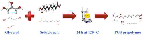 The PGS prepolymer synthesis method, initially described by Kharaziha et al. [], was enhanced as follows. To begin, a 1000 mL three-necked flask was utilized, and it was charged with 113.8 g of glycerol and 202.25 g of sebacic acid powder in a 1:1 molar ratio. The flask was then positioned on a magnetic stirrer equipped with a heating system from KI/Germany and subjected to a slow flow of nitrogen gas while maintaining a high vacuum of less than 50 mTorr using equipment from Memmert/Germany. The reactants were stirred magnetically at 120 °C for 24 h. Once the 24 h duration had passed, the nitrogen line was disconnected, and the system was allowed to cool down to room temperature. As a result, a paste-like material, known as the PGS prepolymer, was formed. The schematic representation of this synthesis process can be observed in Figure 1.
