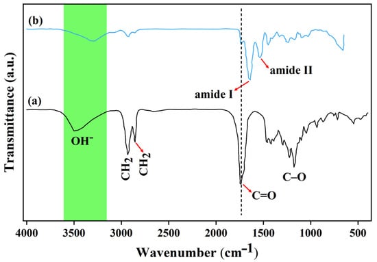 To comprehensively investigate potential interactions between the two polymers and the chemical structure of the scaffolds, Fourier transform infrared spectroscopy (FTIR) was employed as a testing method. The JASCO FT/IR-6300 instrument from Japan (JASCO Corporation, Tokyo, Japan) was specifically utilized for this purpose.