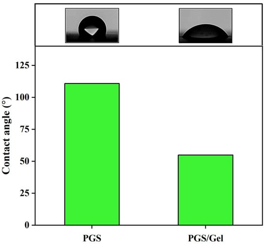 Contact angle measurements were utilized as a means to assess the hydrophilicity of the scaffolds. Hydrophilic surfaces typically exhibit contact angles below 90°, while hydrophobic surfaces tend to display contact angles above 90°. In this study, Figure 4 illustrates that the contact angle of the scaffolds decreased from an initial value of 110.8° ± 4.3° to 54.9° ± 2.1° upon the addition of gelatin, indicating a shift towards hydrophilicity.