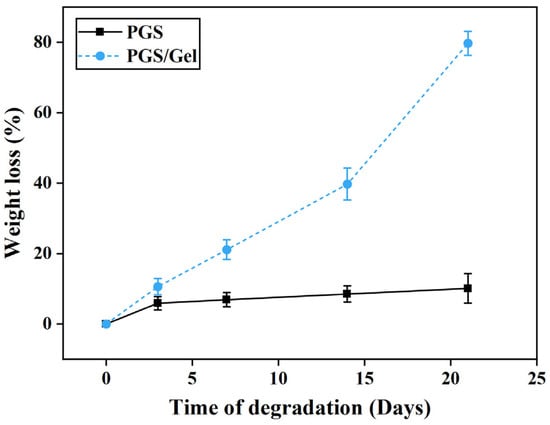 In summary, the study demonstrates that the incorporation of gelatin into PGS scaffolds enhances their biodegradation behavior. The weight loss measurements indicate that the degradation rate is significantly increased when gelatin is present, which is attributed to the faster decomposition of ester bonds. These findings contribute to a better understanding of the factors influencing the degradation kinetics of scaffolds and provide insights for the design and development of bioresorbable materials in various applications.