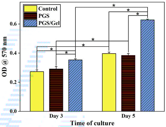In summary, the MTT assay results indicate that the incorporation of gelatin as a natural polymer component in the PGS scaffold formulation improved cell proliferation. The pure PGS scaffold did not negatively affect cell viability, while the PGS/Gel scaffold exhibited significantly increased cell viability compared to the control sample. The enhanced hydrophilicity resulting from the inclusion of gelatin likely played a crucial role in improving cell–substrate interactions. Moreover, the SEM images on the 5th day of culture confirmed that the PGS/Gel scaffold supported cell attachment and spreading, further validating its suitability for cell growth in tissue engineering applications.