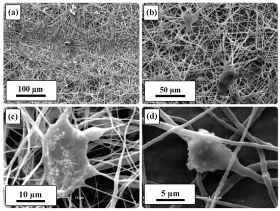 The SEM micrographs of the PGS/Gel scaffold on the 5th day of cell culture at (a) 250×, (b) 500×, (c) 2000×, and (d) 4000× magnifications.