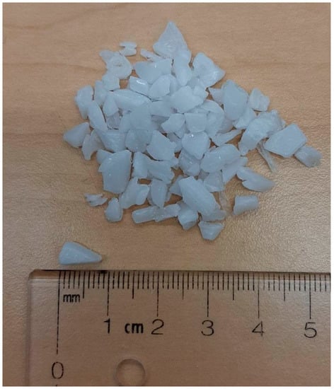 Recycled and reground PC available at a rate of CAD 2.03/kg from Post Plastics in Toronto, Ontario (non-spherical grain size up to approximately 10 mm in length) was used as a substitute binder, and uncategorized beach sand (allowable grain size between 0.06–2 mm) was mixed in as the aggregate. The size of the PC regrind used is shown in Figure 1.