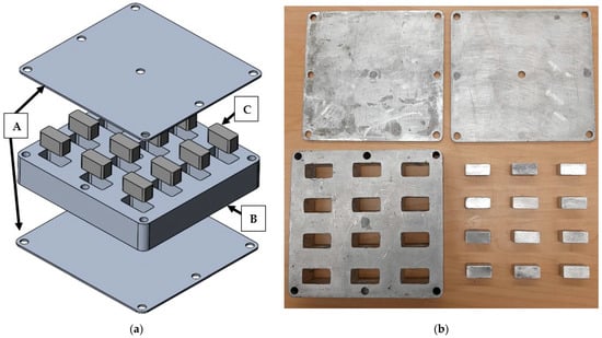Laser-cut aluminum mold components and alignment orientation. (a) 3-D render and (b) physical components of (A) Mold Lid X2, (B) ASTM D695 Pocket Mold, (C) Mold Plug X12.