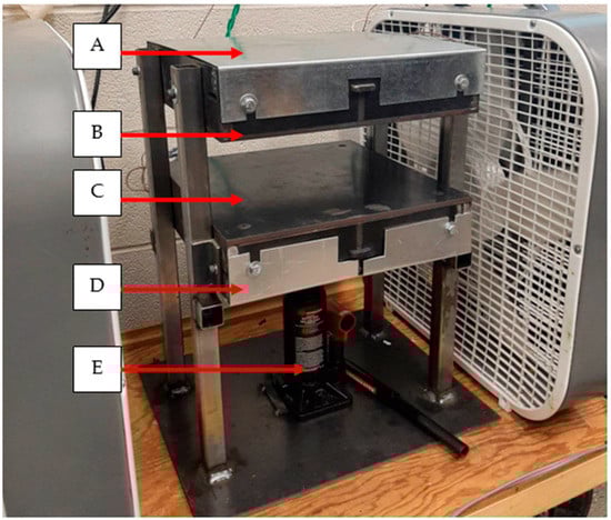 Open-source scientific hot press used for manufacturing all samples. (A) Fixed upper plate insulated subassembly and heater enclosure. (B) Fixed upper pressing plate work surface. (C) Adjustable lower pressing plate work surface. (D) Adjustable lower plate insulated subassembly and heater enclosure. (E) A 4-ton bottle jack for vertical actuation.