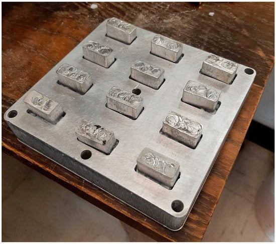 An aluminum mold consisting of a 1/8″ base, 1/8″ lid, 1″ body, and ½″ plugs was laser-cut to provide a 3 × 4 matrix of 12 total ASTM D695 standard 1″ × 1” x ½″ samples, as seen in Figure 2. The designs for the mold are released under CERN OHL v2 and are available on the Open Science Framework [,,].