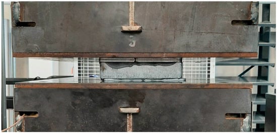 Compositions of 0% (control), 20%, 30%, 40%, and 50% sand by weight were selected based on proven success ranges of sand–plastic ratios across previous studies with different polymers []. The appropriate ratios of sand and plastic were weighed using a digital scale (+/− 0.01 g). The mold was heated and samples were formed using the open-source scientific hot press in Figure 3 []. All handling of the aluminum mold and hot press was performed using thermally resistant gloves insulated up to 300 °C (minimum). Box fans were used for cooling but were not required if cycle time was not a user concern. Once set, the samples were ejected from the mold using a vice and tested in an Instron 5980 Series universal testing machine using a 100 KN load cell until failure.