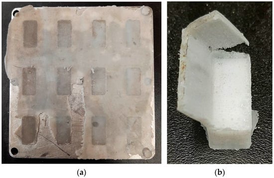 (a) Released mold with visible flash. Mold was filled with 50% sand on the left and 20% sand on the right. (b) The 100% PC sample example immediately following part ejection and prior to cleanup.