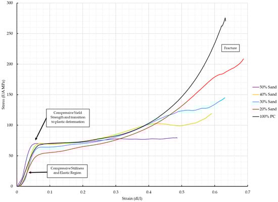 After each sample was subjected to a compression test to failure, the resulting stress–strain curves were plotted and compared to a 100% recycled PC sample produced using the same mold and process. The resulting strength behavior in Figure 8 was observed.
