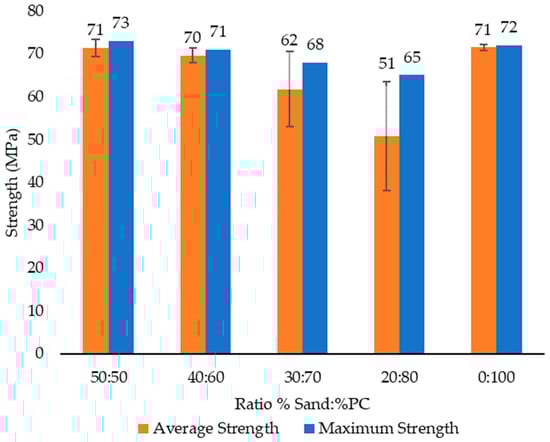 Summary of the impact of sand % in the sand/PC composite on maximum strength and average strength (MPa).