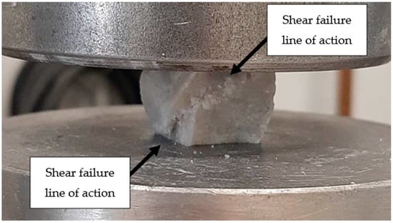 The failure mechanism of high sand compositions more closely reflects that observed in concrete due to the transition from ductile to shear failure. This can be seen in Figure 11 following the indicated shearing line of action. The PC acts as a binder for the sand and enables the sand to contribute to the rigidity of the sample. This explains the increase in strength and stiffness up to failure, at which point the sand begins to separate from the PC, causing cracks to propagate between the grains of sand and along the shear plane until the material crumbles to the same effect as concrete []. The contribution of sand to crack propagation and shear failure can be observed by comparing the curves in Figure 8. The control demonstrates smooth stress vs. strain behavior in the plastic region following yield as the material flows. Alternatively, all sand composites show visible fluctuations from a theoretical smooth curve in the plastic region, with more appearing as the percentage of sand increased. The moment sand is introduced to the material, the smooth flow behavior of the thermoplastic is interrupted to a varying degree, depending on the amount of sand used.