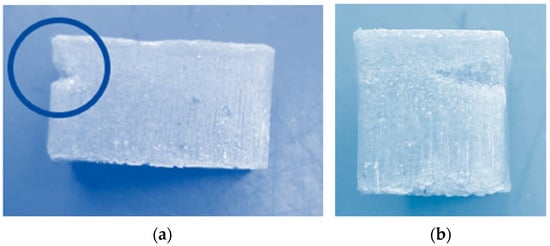 In these future tests, it is worth exploring alternative mixing strategies that could be employed to promote a more homogenous sample. Alternative research approaches have used an external mixing chamber to introduce the plastic to preheated sand under continuous agitation []. Once the mixture is homogenous, it can be poured directly into the mold and stamped down. This may help to avoid cases where pockets of unmixed sand were observed at the corners of the mold. An example of these edge defects formed by unmixed sand can be seen in Figure 12. With improved homogeneity, the mechanical properties of the samples will improve as well.