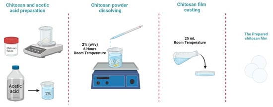 To prepare the chitosan film we used acetic acid as a solvent. The preparation involved several steps (Figure 2), including dissolving the chitosan powder in acetic acid, casting the solution onto a substrate, and evaporating the solvent. The chitosan–acetic acid solution was first prepared by dissolving the chitosan powder in acetic acid, typically at a concentration of 2% w/v. A homogenous solution was obtained by stirring the mixture continuously at room temperature for a period of 6 h. The solution was then casted on petri dishes at a volume of 25 mL to form a uniform layer, after which the solvent was evaporated by leaving the plate to dry at room temperature.