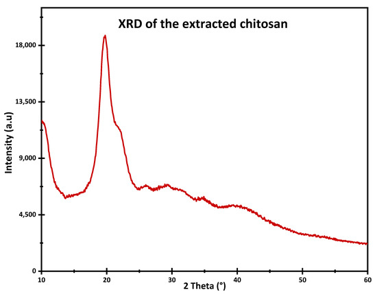The structural properties of the extracted chitosan were investigated using the XRD technique. The XRD pattern of chitosan is presented in Figure 4, and the peaks observed at 2θ values match the values reported in the literature [42,43]. The pattern shows a broad and poorly defined diffraction peak around 20°, indicating a predominantly amorphous or poorly crystallized structure. The broadening of the peaks can be attributed to the amorphous nature of the polymer. Importantly, no impurity peaks were detected in the XRD pattern. This structural characteristic can have significant implications for the mechanical properties of the chitosan film. The amorphous or poorly crystallized nature of chitosan typically results in increased flexibility and elasticity, which are desirable traits for various applications [44]. The chitosan film’s ability to undergo deformation without fracturing or losing its integrity can be attributed to its poorly crystallized structure. These properties make it suitable for applications where flexibility, tensile strength, and elongation at break are important.