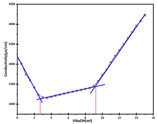 To investigate the conductivity variation of the chitosan solution, a solution was prepared by dissolving 150 mg of chitosan in 10 mL of hydrochloric acid (0.1 N), and the volume was adjusted to 200 mL using distilled water. The prepared solution was subjected to titration with a sodium hydroxide solution (0.1 N) under continuous stirring. Figure 5 shows the variation of the conductivity of the chitosan solution as a function of the volume of sodium hydroxide added during the titration process.