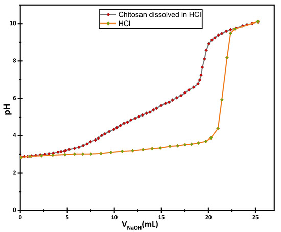 The determination of DD by pH-meter titration was carried out as described in the literature [48,49,50]. A solution of chitosan was prepared by dissolving 135 mg of chitosan in an excess of HCl (0.1 N) solution and then neutralizing this solution with sodium hydroxide (0.05 N) solution. Figure 7 shows the titration curve for chitosan.