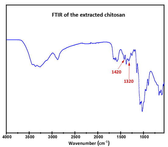 The presence of acetyl groups affects the IR spectra of chitosan, and the position and intensity of the IR peaks can be used to identify the presence of acetyl groups in the sample. The DD is calculated from the absorption bands located at 1320 and 1420 cm−1 (Figure 9). The first band is characteristic of the acetylated amine or amide function while the second was chosen as the reference band.