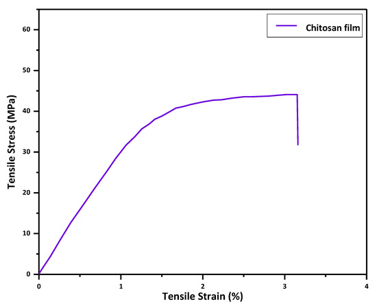 The chitosan films demonstrated a tensile strength of 43.9 MPa, indicating the maximum stress the material can endure before fracture occurs (Figure 10). Additionally, the elongation at break was measured to be 3.14%, signifying the maximum strain that the material can undergo before rupturing. These findings indicate the potential of chitosan films to enhance the mechanical properties of composites.