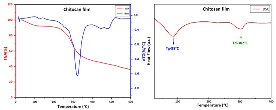 DSC analysis was also performed on the chitosan films using a differential scanning calorimeter (DSC) to determine the glass transition temperature (Tg) and the thermal degradation temperature (Td) of the films. The curve (Figure 11) exhibits a first sharp and broad endothermic peak with a maximum at 88 °C, which corresponds to the glass transition temperature (Tg) of chitosan film. The second endothermic peak appeared 302 °C, which corresponds to the thermal degradation temperature (Td). This result suggests that the chitosan film underwent a two-step degradation process. The first step was the loss of the absorbed water molecules from chitosan, followed by the thermal decomposition of the chitosan polymer. These results align with those reported in the literature [52,53,54].