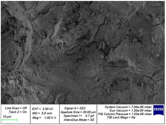 Three samples of each modification were subjected to static loading on a P-50 press (PKC ZIM, Armavir, Russia). A load of 10 tons was applied to each of these samples and fixed for 30 s. After that, the load was reduced to 0, and the samples were sawn into three equal parts. The load was set at about 50% of the expected collapse load. It was important to simulate the onset of formation and development of cracks in the structure of the samples. The magnitude of the applied load will affect the number and proportion of defects in the samples but will not affect the results of detection and calculation of the areas of these cracks. From the central third (middle) of the sample, a sample was sawn out for microstructure examination using an electron microscope (Carl Zeiss Microscopy, Jena, Germany). The samples were examined with a magnification of 100–4000 times. The remaining three samples of each modification were tested on a press until destruction and fixation of the compressive strength.