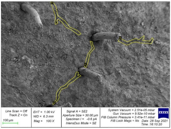 When preparing data for inputting both models, it is necessary to carry out the process of marking images (image annotation)—this is one of the key stages in creating an effective computer vision system. This process converts the information into a format that can be understood by the image analysis algorithm. During the marking process, the original image is supplemented with metadata about the location of the defect in case it is fixed by an expert technologist [54,55]. Figure 3 shows an image annotated with the VGG image annotator. It is worth noting that a number of images have the effect of “blur” (visible in the area of crack No. 4), which in the future will give resistance to this external factor when using the developed algorithm in real conditions.