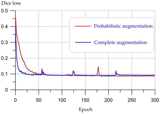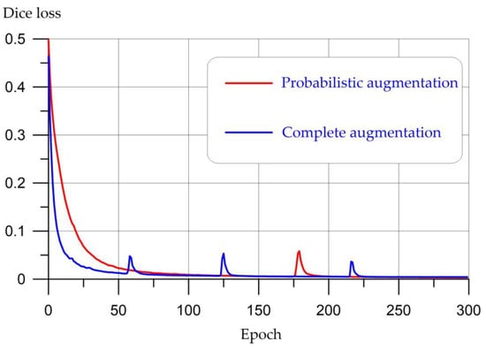 To train the models, the Adam stochastic optimization method [56] was used, which has demonstrated its effectiveness in many problems. The peculiarity of this method is that it simultaneously uses the adaptation of the gradient descent step taking into account the accumulated gradients, as the Adagrad, Adadelta, Rmsprop and similar methods do, and the idea of momentum accumulation, as Momentum and Nesterov Adaptive Gradient (NAG) do. The value 10−4 was used as the learning rate parameter. The training process took 300 epochs, was carried out on the basis of NVIDIA Tesla T4 accelerators and took 180 min for the first model and 220 min for the second. The gradient descent step was performed on a batch of size 10, applying probabilistic augmentation to each image within the batch in the case of model 1 and on a batch of size 10 in the case of model 2.