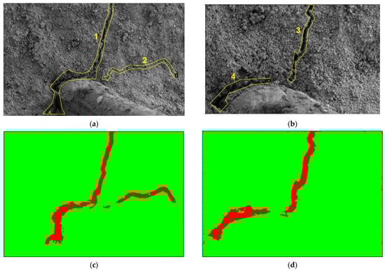 Results of the detector operation: (a,b) original image; (c,d) the result of model 1; (e,f) result of model 2; 1, 2, 3, 4—sequence numbers of cracks (assigned to them automatically when marking); red—area of defects in the form of cracks, green—crack-free microstructure area.